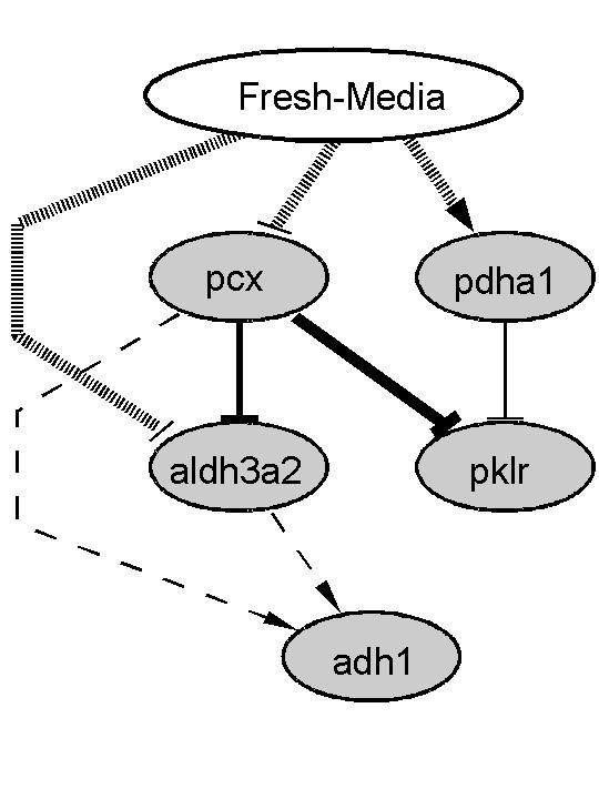 Primary hepatocytes were exposed to a stimulus by exchanging culture medium, thereby simulating changes in the blood composition. The expression of genes at different time points was recorded. Differentially expressed genes were clustered using fuzzy c-means algorithm into five groups. The arcs of the possible network were identified using the NetGenerator algorithm under the restriction of biological knowledge. The analysis was restricted to the main metabolic pathways of hepatocytes. The reverse engineering approach was applied to validate the data and a network of interacting genes was generated. Pyruvate kinase and pyruvat carboxylase are genes that rapidly respond to the changes in the medium composition.