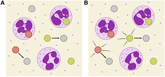 This model is a variant of the previously developed SBM of whole-blood infection assay. While in the previous model a spontaneous immune evasion mechanism (A) was implemented in this model immune evasion was caused by PMN molecule secretion (B).